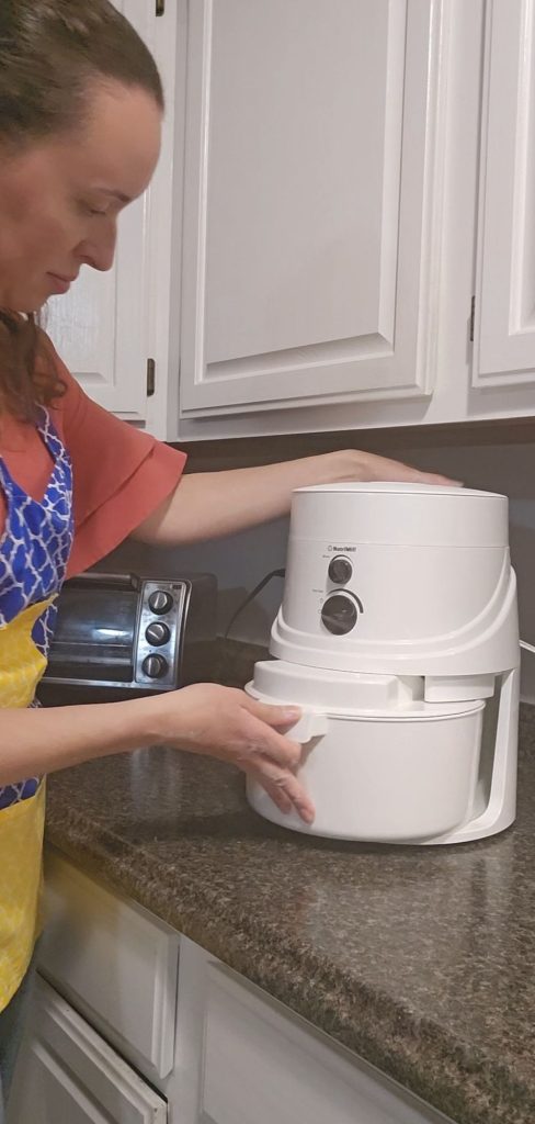 The mill stands 13 inches tall (with the hopper extension) with a 12 x 12 inch base. The hopper can hold 12 cups of grain and the flour bowl can hold 20 cups of milled flour. What’s nice about both is that they operate on a 1 to 1 ratio, meaning you can know that whatever you put in the hopper, the flour bowl will hold.