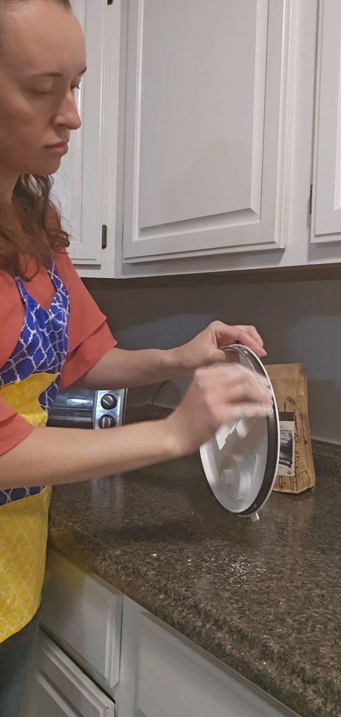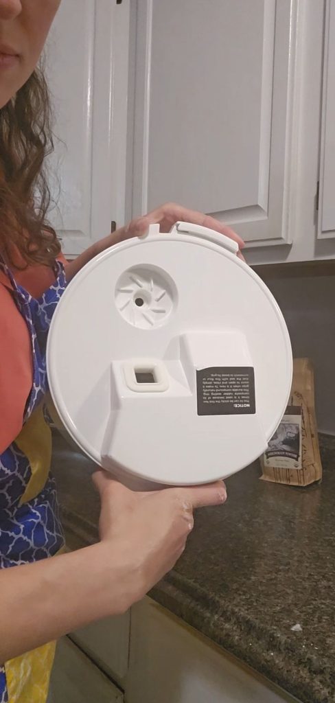 When the flour bowl lid is locked into place and the bowl is assembled, place the filter in the filter inset of the flour bowl lid.