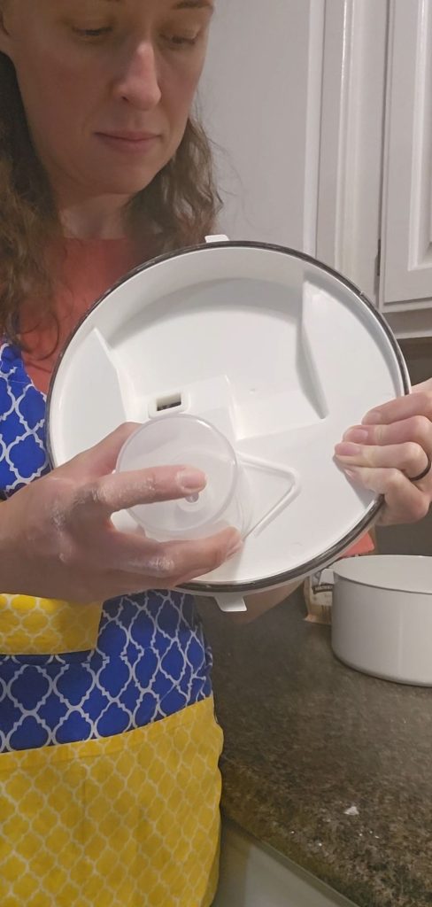 Find the separator cup and attach it to the flour bowl lid. When those are together, fit the flour bowl lid over the flour bowl.