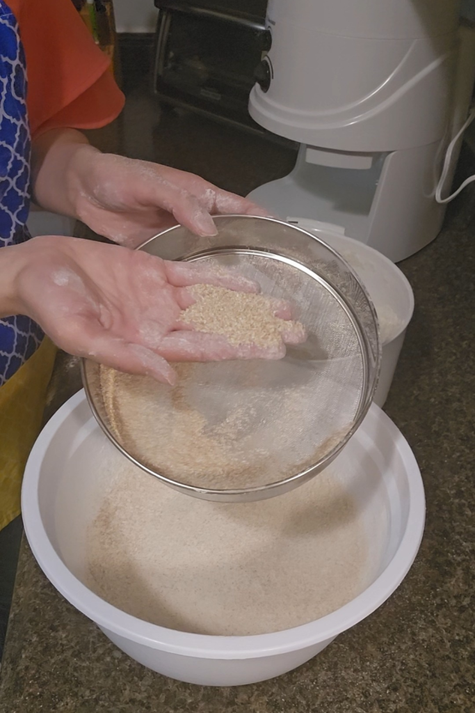 While I wait to invest in this mixer and the sifter attachment, we use a fine mesh sifter and sift out the bran. This step is not necessary, but it does yield softer baked goods. The bran from freshly milled flour can sometimes come off as gritty. If you are sensitive to food textures, sifting your flour may be the right course of action for you.